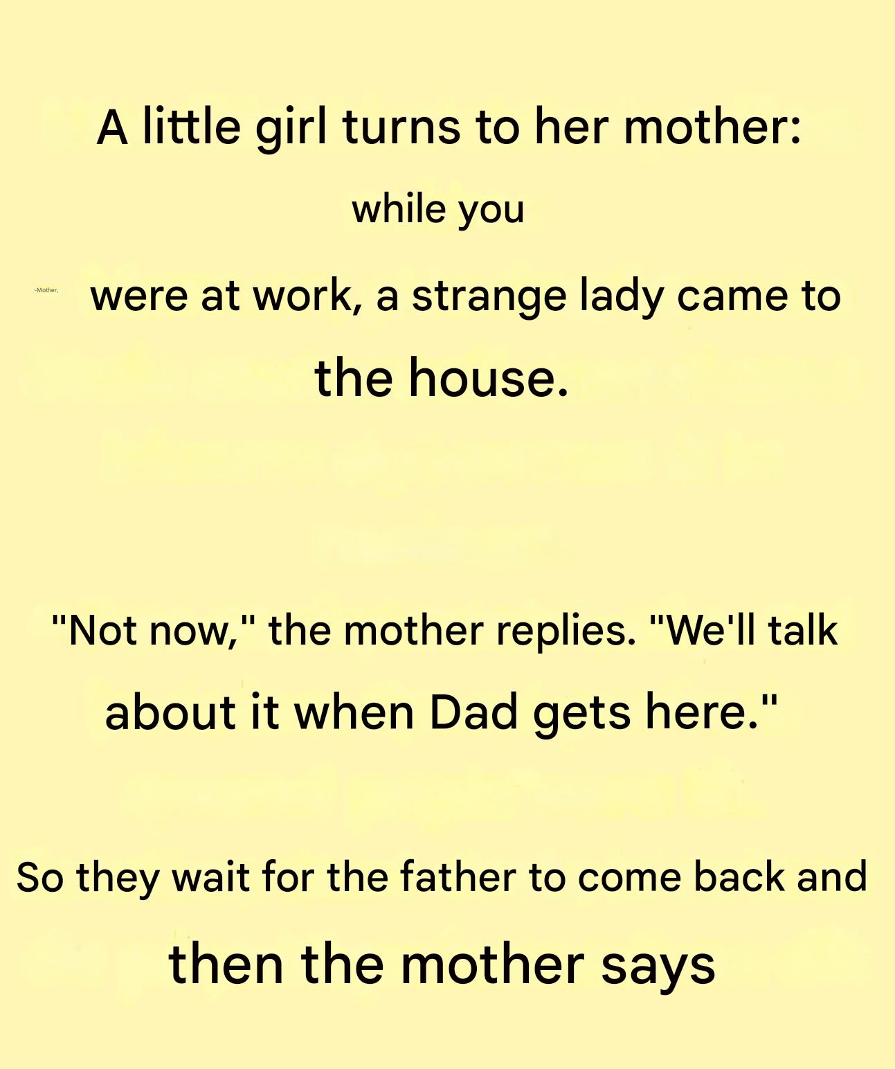 A completely innocent little girl sits at the table and, with her mischievous little face, says something that will shatter the peace of her family: "Mom, while you were at work, a strange lady came home." Although this statement may seem harmless, it actually hides much more than it seems . The mother, absorbed in her homework, instantly freezes. A strange lady? This hint arouses suspicion, but the mother prefers to postpone the discussion until later, waiting for the father to arrive.