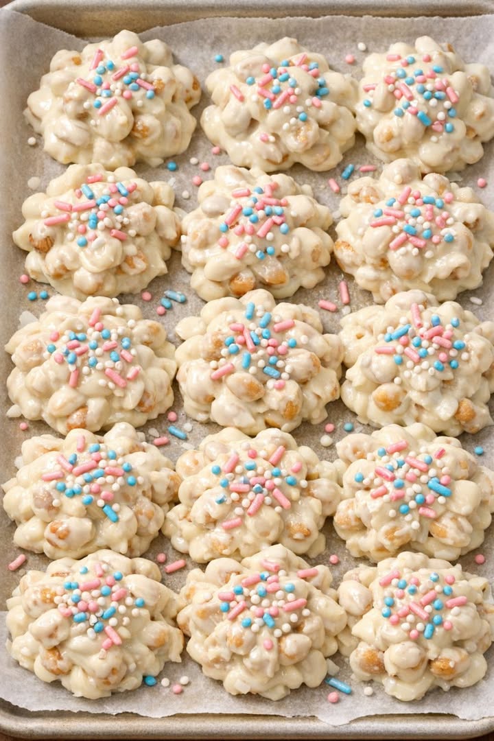 While the clusters are still warm and glossy, immediately sprinkle the tops with pastel sprinkles, pressing them very lightly if needed so they stick.