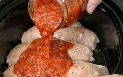Pour store-bought marinara sauce and these 5 ingredients over chicken breasts into a slow cooker for an easy, craveable dinner that never gets old