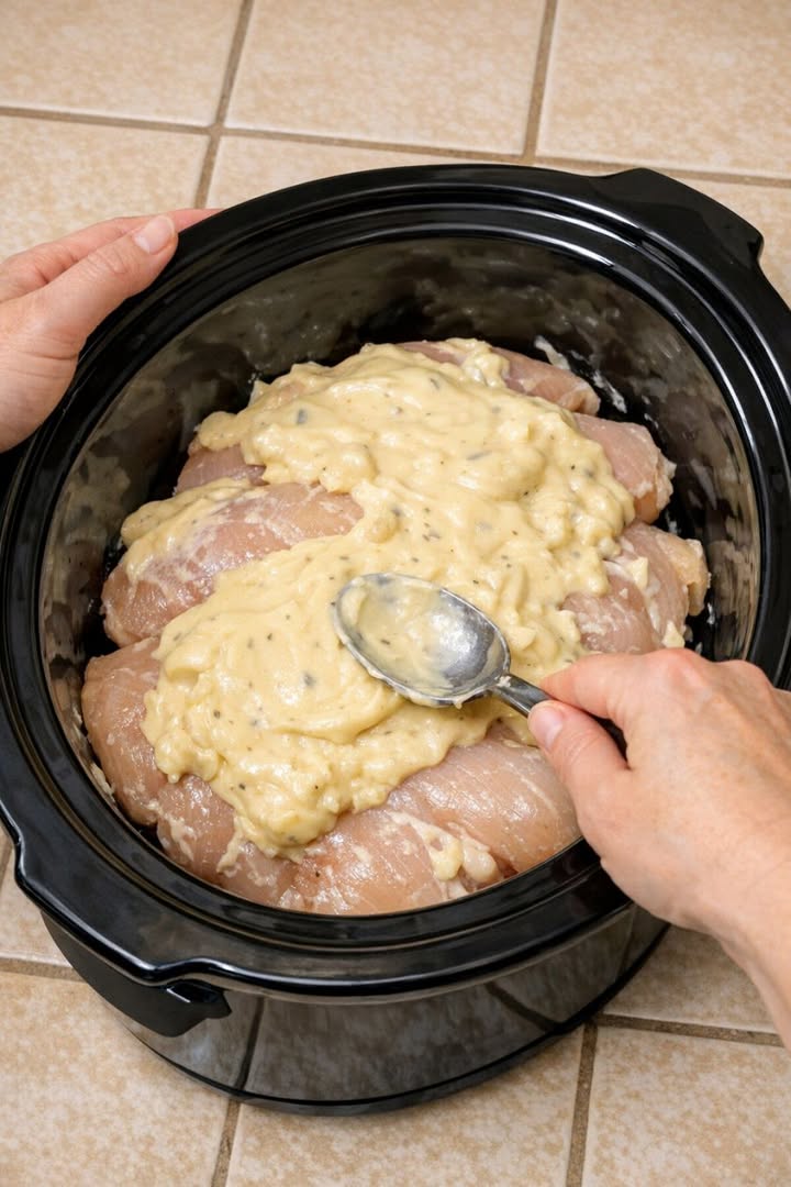Open the cans of cream of chicken soup. Using a spoon or spatula, spread the soup directly over the tops of the raw chicken breasts, covering them from end to end. It will look thick at this stage, but it will loosen as it cooks.