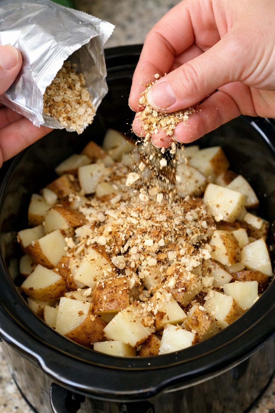 Sprinkle the dry onion soup mix evenly over the potatoes in the slow cooker. Use your hands to scatter it from above so it falls over the potatoes in a light, even layer, just like in those close-up process shots where you can see every grain of seasoning.