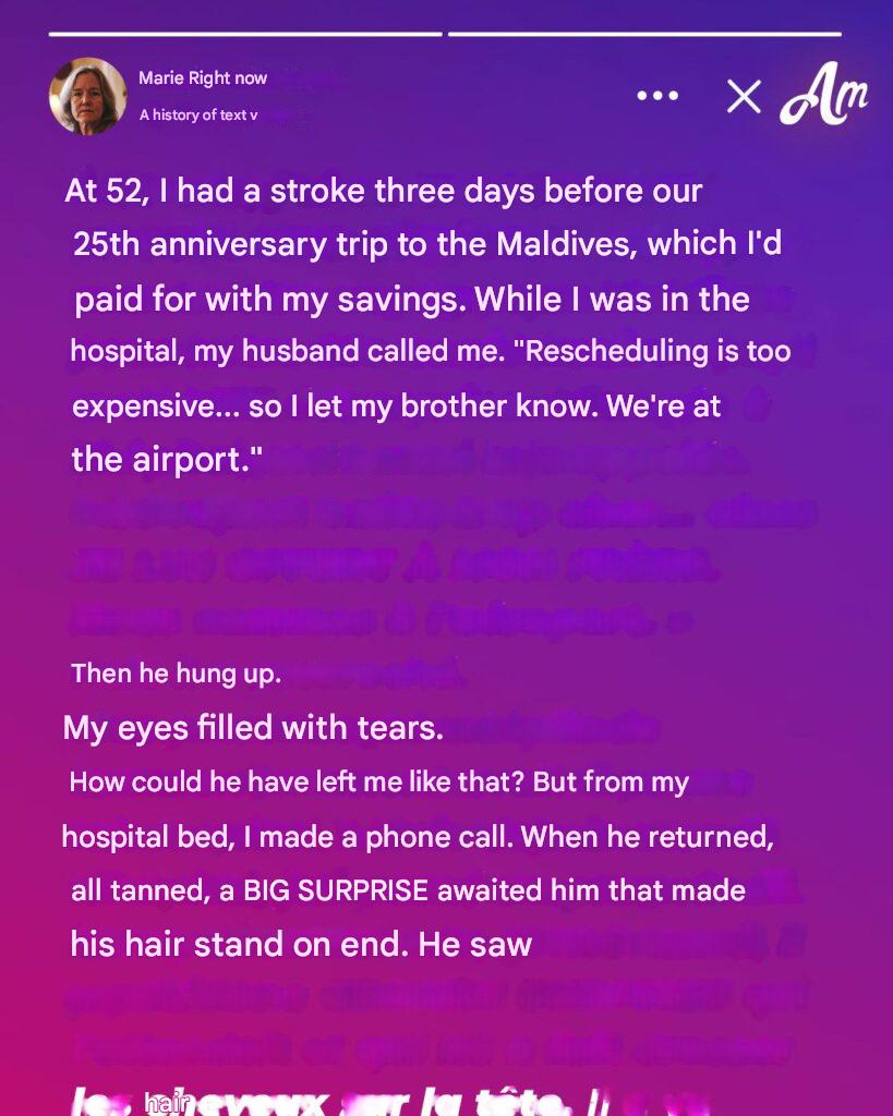 Three days before our dream anniversary trip to the Maldives, I had a stroke. While I was in bed in the hospital, unable to move, my husband called me… from the airport. "Postponing is too expensive," he said, before hanging up. That call changed everything and set in motion a plan he hadn't foreseen.